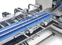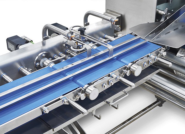 Machine Flow Pack horizontale (HFFS) haute cadence qui réalise un emballage type coussin avec trois soudures totalement hermétiques sous atmosphère modifiée (MAP) pour le secteur de l'alimentaire frais. Jusqu'à 250 produits /min.