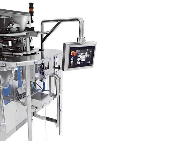Enveloppeuse verticale (VFFS) de conception hygiénique avec changement de format facile. Conçue pour le conditionnement en continu à hautes cadences.