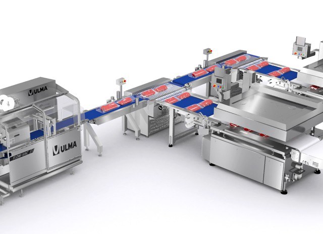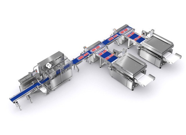 Solution automatique d'emballage sous-vide pour les découpes industrielles de viande avec double système de transfert vers les cloches à vide.