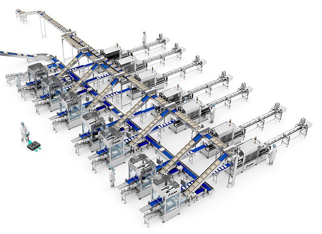 Chacune des sept lignes est équipée de cellules robotisées d' encaissage capables de former la mosaïque de barquettes requise par la caisse. Elles sont approvisionnées par les caisses qui arrivent du système de transport et de distribution des caisses.