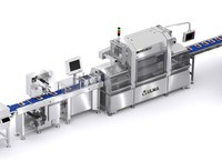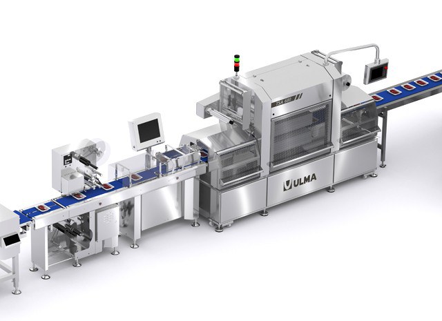 L' operculeuse automatique TSA d' ULMA permet de sceller des barquettes de viandes sous atmosphère contrôlée pour augmenter la durée de conservation. Elle est équipée d' un dépileur automatique de barquettes qui dépose les barquettes sur le convoyeur d' alimentation.