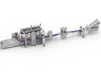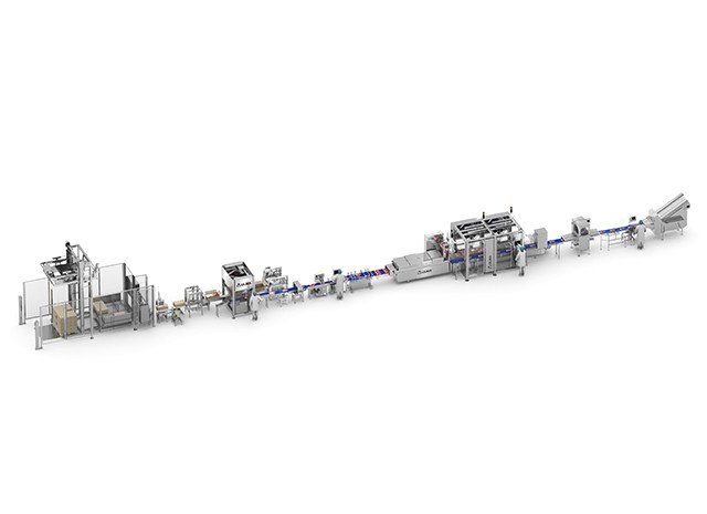 La ligne commence par une trancheuse automatique qui possède un magasin d' accumulation de produit pour alimenter la cellule de chargement robotisée composée de deux robots qui alimentent la thermoformeuse.