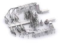 L' installation comprend un système de transport et de distribution de steaks hachés surgelés. Le produit reçu est distribué aux différentes lignes d' emballage individuelles au moyen de rampes et de guides d' alignement.