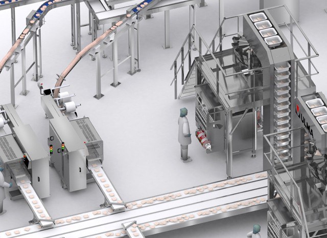 Les emballages préalablement fabriqués à l' unité sont déposés sur un tapis qui amène à un système d' élévation pour alimenter les multi-têtes qui à leur tour alimentent les ensacheuses verticales qui réalisent les sachets en multipack.