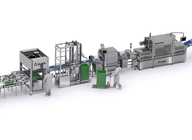Ligne complète de conditionnement entièrement automatisée pour le conditionnement de blancs de poulet dans des barquettes operculées.