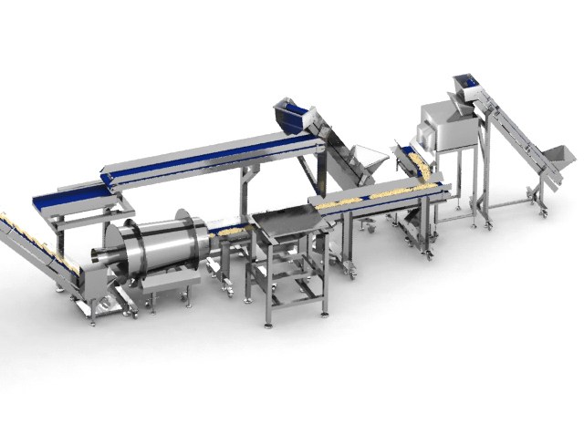 La ligne débute par une râpeuse à fromage. Le produit est récupéré par un tapis qui lit automatiquement les quantités reçues et ajoutent la bonne dose d' anti-agglomérant (généralement de la fécule de pomme de terre).