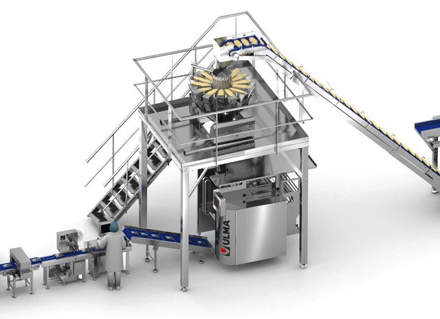 Le produit est élevé jusqu' à la peseuse multi-têtes qui réalises les doses nécessaires pour chaque sachet et est transféré à l' ensacheuse.