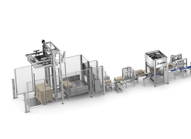 La ligne débute par une trancheuse automatique qui possède un magasin d' accumulation du produit pour approvisionner la cellule de chargement robotisée qui se compose de deux robots qui alimentent la thermoformeuse.