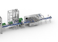La ligne dispose d' un dépileur automatique de caisses vides pour alimenter la cellule de mise en caisse robotisée.