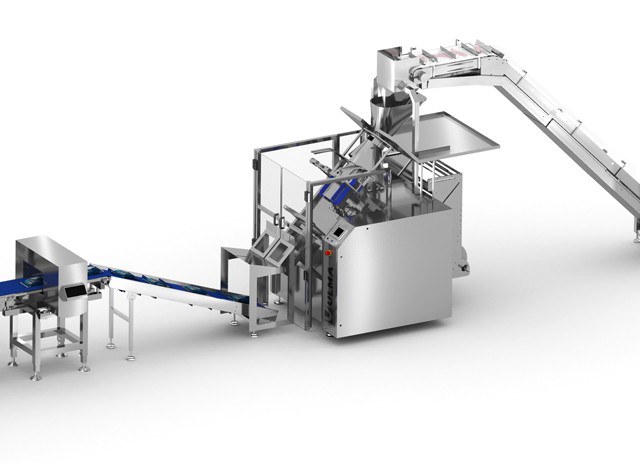 Le système de pesage pèse le poids donné pour chaque lot et le tapis d' élévation reçoit dans chaque godet la dose de produit en s' adaptant au poids spécifique de chaque sachet.