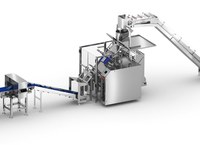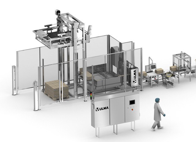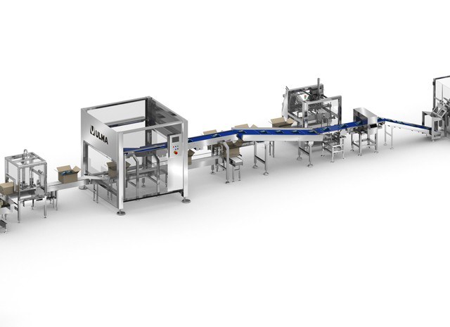La ligne se compose d' une formeuse de caisses, d' une cellule d' encaissage robotisée et d' une fermeuse. Tout cela est parfaitement intégré dans la ligne pour que le processus soit entièrement automatisé.