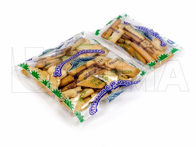 Conditionnement de petits pains grillés en sachet "coussin" sur une ensacheuse verticale (VFFS) Machine inclinée à 45° pour ne pas endommager le produit. 1177_1.jpg VTI 200 Enveloppeuse verticale (VFFS) qui réalise un sachet à 3 soudures. Idéale pour des applications à cadences intermédiaires (jusqu'à 70 cycles/mn) avec un rapport qualité/prix exceptionnel.