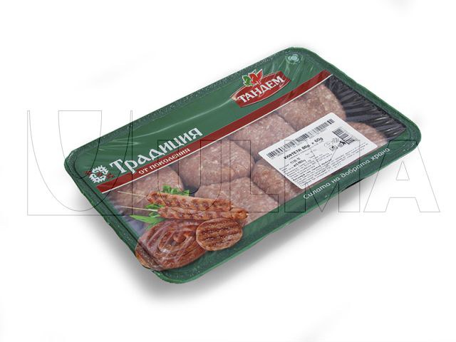Conditionnement de mini steaks hachés en barquette operculée.