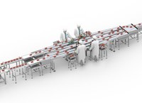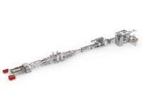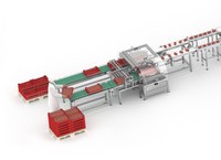 Complete lijn voor het verpakken van trays met aardbeien in een flowpacker.
