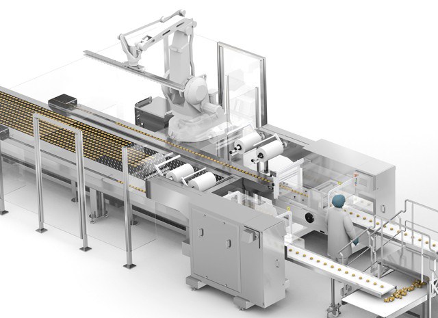 Met behulp van een antropomorfe robot worden de muffins die uit de oven komen op de aanvoerband van de flowpacker geladen.