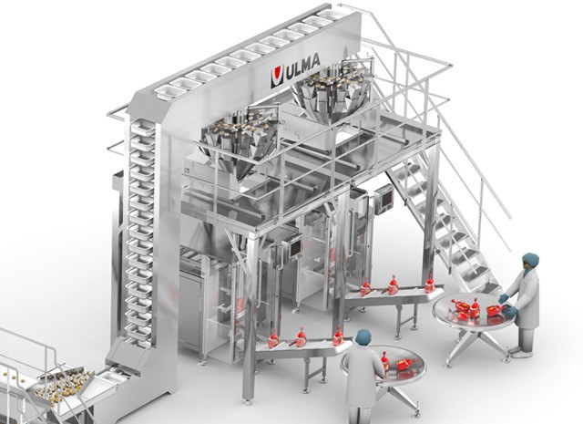Door middel van transportbanden en liftsysteem worden de getransporteerd naar de gecombineerde multi-head wegers die de vastgestelde multipack-doses uitvoeren.