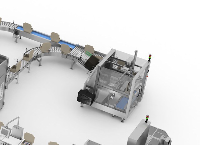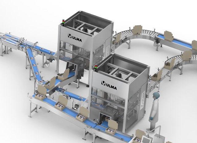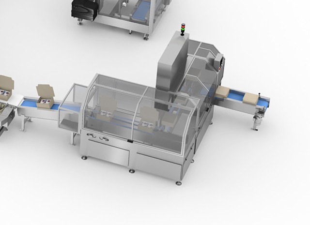 De casepackcellen hebben een deltarobot en een zakgroeperingssysteem. De robot maakt gebruik van een vacuümsysteem om de groepen te manipuleren en in de bijbehorende dozen te plaatsen. De kistverpakkingscellen zijn flexibel omdat ze het mogelijk maken om met de verschillende klantreferenties te werken en verschillende kisttegels te maken.