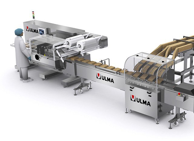 Geautomatiseerd aanvoersysteem van vier rijen knapperige broden op de rand in een flowpacker