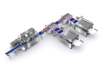 Automatische vacuümverpakkingsoplossing voor industriële stukken vlees met dubbel transfersysteem naar vacuümkamers.