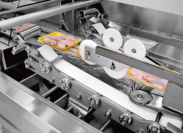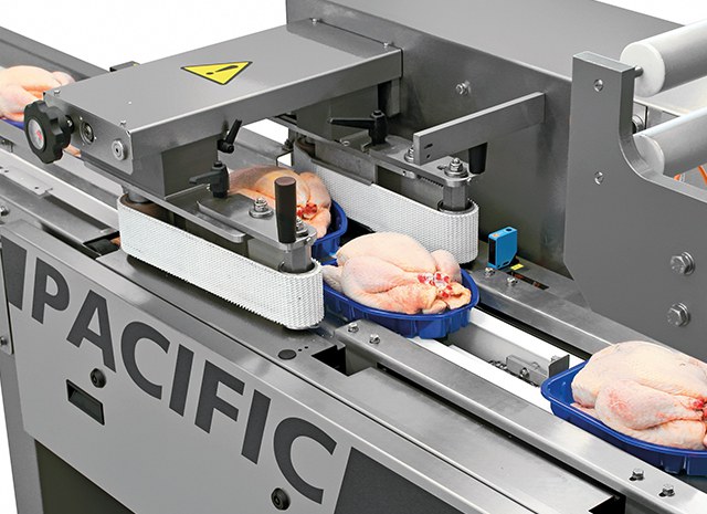 Het PACIFIC SSF systeem is een krimpfolie verpakkingsmachine die een lekdichte verpakking maakt voor vlees en gevogelte producten op tray.