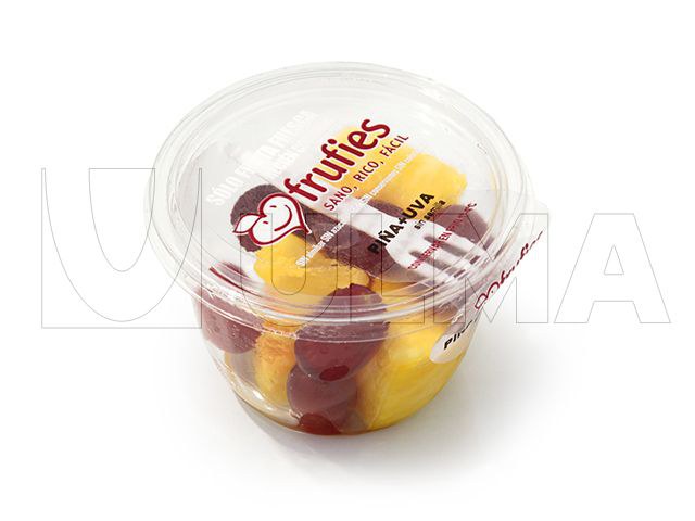 'Ready to eat' fruit MAP verpakt met traysealer Er is een vork ingevoegd tussen de folie en de deksel. 2071_1.jpg TSA 540 Compacte automatische traysealer voor voorgevormde trays. Geschikt voor de productie van verpakkingen met beschermende atmosfeer (MAP en EMAP) en voor vacuüm skinverpakkingen. Een robuuste traysealer geschikt voor lijnintegratie.